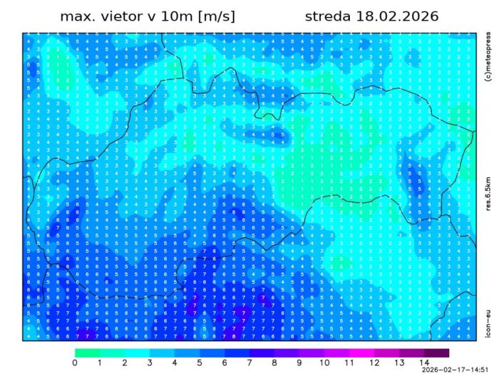 Obr. 4: Predpokladaná maximálna rýchlosť vetra na Slovensku v stredu (18. 2.) podľa modelu ICON-EU