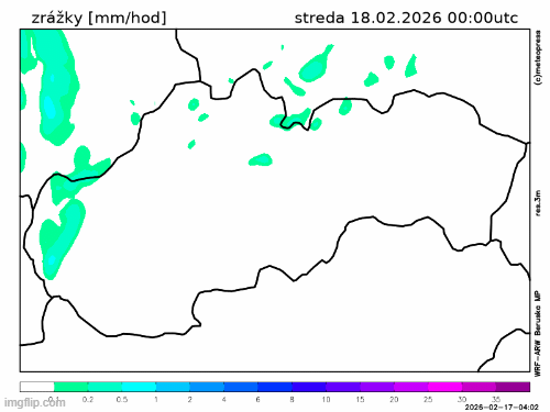Obr. 3: Predpokladaný vývoj zrážok na Slovensku v stredu (18. 2.) podľa modelu WRF