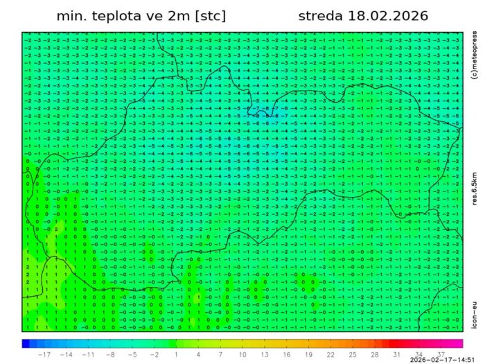 Obr. 5: Predpokladaná minimálna teplota vzduchu v stredu (18. 2.) podľa modelu ICON-EU