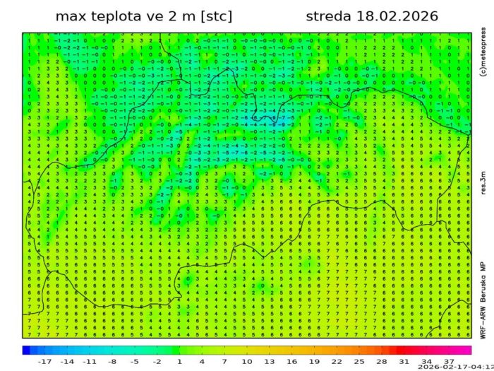 Obr. 6: Predpokladaná maximálna teplota vzduchu v stredu (18. 2.) podľa modelu WRF