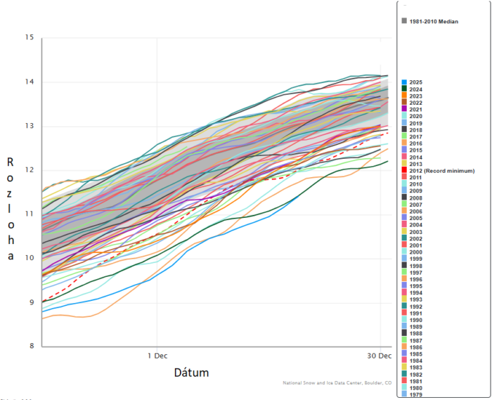 Obr. 3: Rozloha morského ľadu v Arktíde v novembri a decembri v rokoch 1979-2025. Rok 2025 a 2016 sa v tomto období striedal a na najnižšie nameraných hodnotách. Zdroj: NSIDC