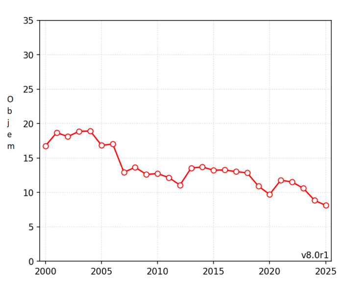Obr. 2: Objem morského ľadu v novembri v Arktíde (1000 km³) v mesiaci november od roku 1999 do roku 2025. Zdroj: DMI