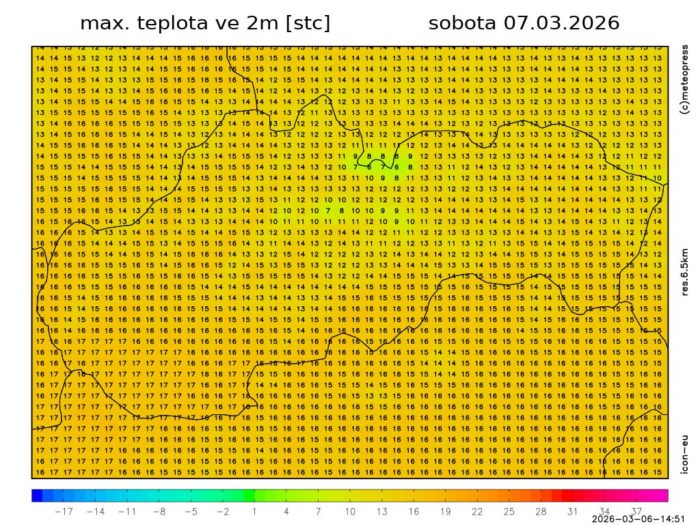 Obr. 4 Maximálna denná teplota podľa modelu ICON-EU.