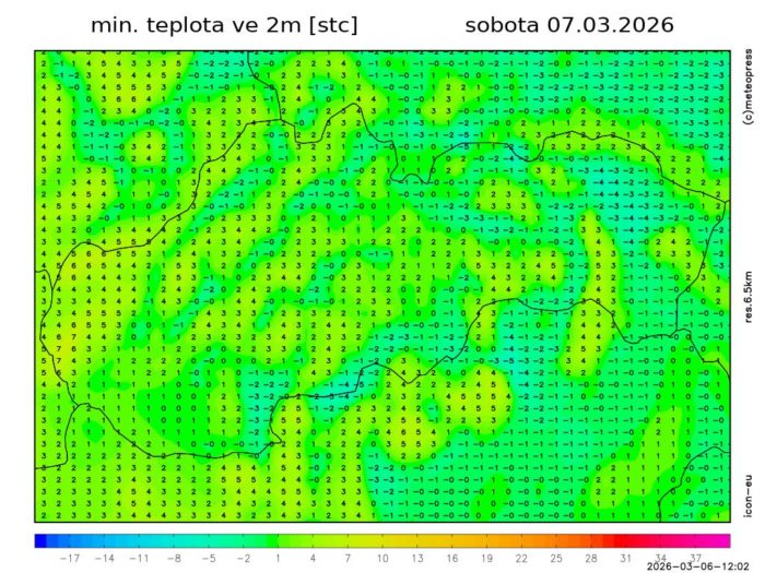 Obr. 3 Minimálna nočná teplota podľa modelu ICON-EU.