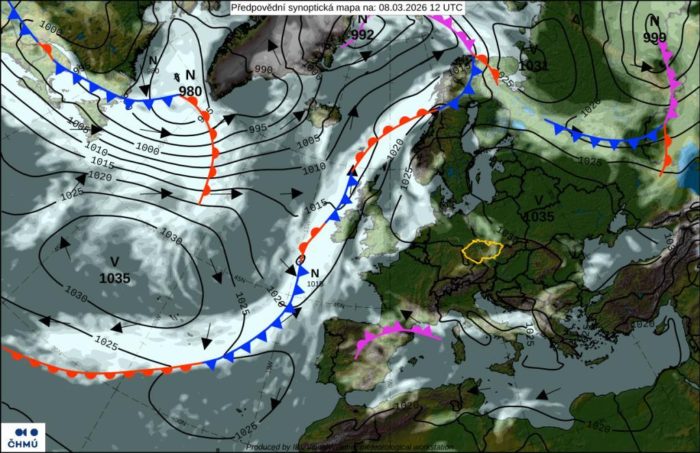 Obr. 1 Synoptická analýza na sobotu 8.3.2026. Zdroj: ČHMÚ.