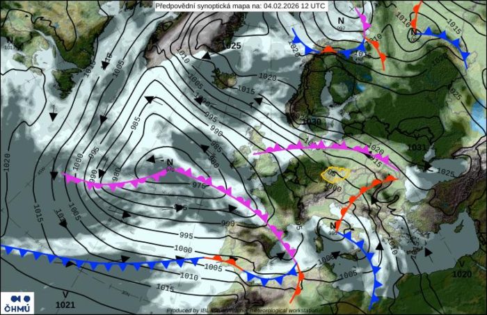 Obr. 1: Predpoveď synoptickej situácie na stredu, 4. februára. Zdroj: ČHMÚ