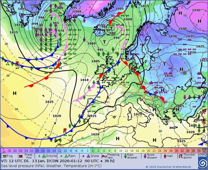 Obr. 1: Synoptická situácia – utorok (13. 1.)