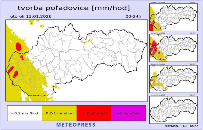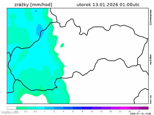 Obr. 3: Predpokladaný vývoj zrážok na Slovensku v utorok (13. 1.) podľa modelu ICON-EU