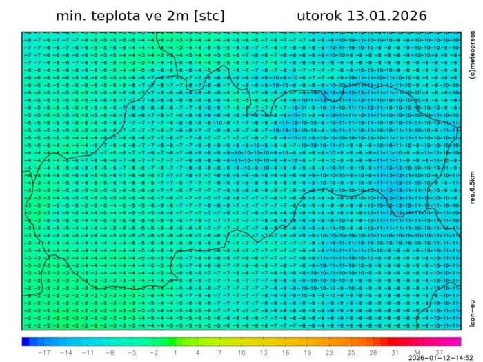 Obr. 6: Predpokladaná minimálna teplota vzduchu v utorok (13. 1.) podľa modelu ICON-EU