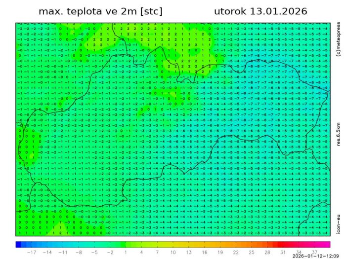 Obr. 7: Predpokladaná maximálna teplota vzduchu v utorok (13. 1.) podľa modelu ICON-EU