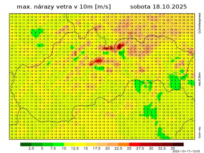 Obr. 4: Predpokladané maximálne nárazy vetra v sobotu (18. 10.) podľa modelu ICON-EU