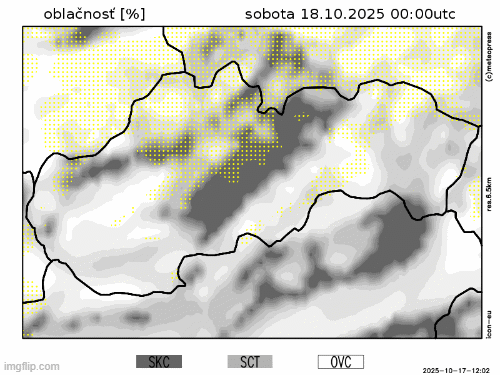 Obr. 2: Predpokladaný vývoj oblačnosti na Slovensku v sobotu (18. 10.) podľa modelu ICON-EU