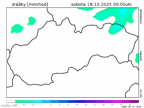 Obr. 3: Predpokladaný vývoj zrážok na Slovensku v sobotu (18. 10.) podľa modelu ICON-EU