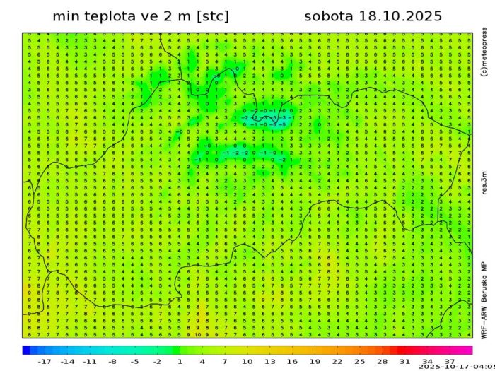 Obr. 5: Predpokladaná minimálna teplota vzduchu v sobotu (18. 10.) podľa modelu WRF