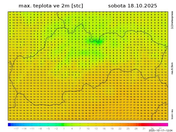 Obr. 6: Predpokladaná maximálna teplota vzduchu v sobotu (18. 10.) podľa modelu ICON-EU