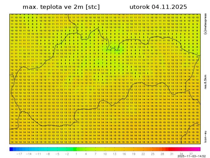 Obr. 4: Predpokladaná maximálna teplota vzduchu v utorok (4. 11.) podľa modelu ICON-EU