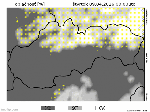 V noci jasno až polooblačno, na severe a východe miestami oblačno až zamračené a tu miestami prehánky, od stredných, spočiatku aj v nižších polohách, sneženie. Cez deň jasno až polooblačno, na severe a východe premenlivá, prevažne veľká oblačnosť. Ojedinele, najmä na severe, prehánky, od stredných polôh aj sneženie. Stále veterno !