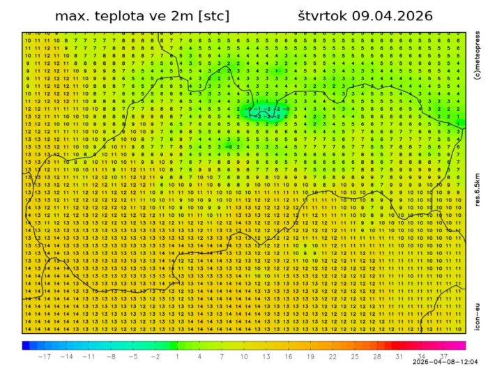 Obr. 4 Maximálna denná teplota podľa modelu ICON-EU