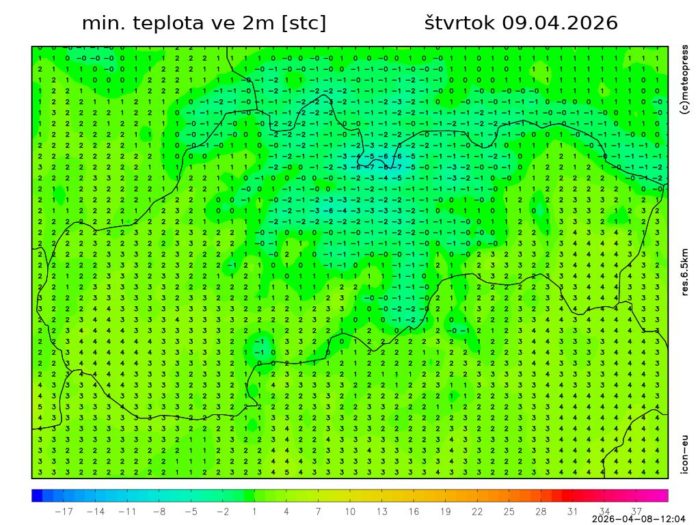 Obr. 3 Minimálna nočná teplota podľa modelu ICON-EU