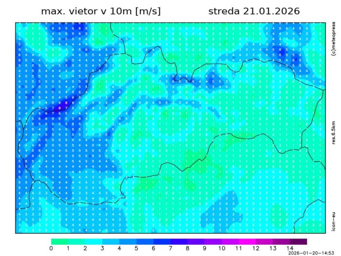 Obr. 3: Predpokladaná maximálna rýchlosť vetra na Slovensku v stredu (21. 1.) podľa modelu ICON-EU