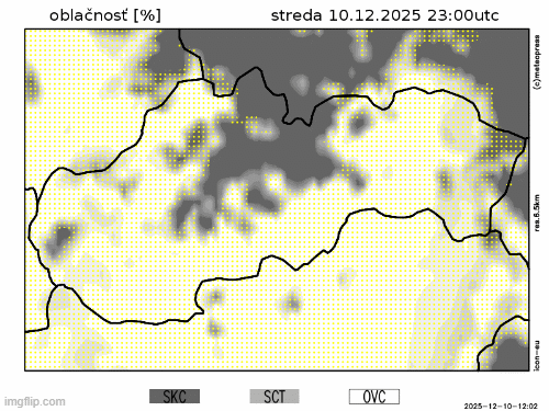 Očakávame naďalej prevažne zamračený charakter počasia. Pri prechode frontu sa oblačnosť zväčší aj v stredných a vyšších polohách, kde môže byť ešte v noci oblačnosť zmenšená. K večeru sa naopak oblačnosť ojedinele zmenší dokonca aj v nižších polohách.