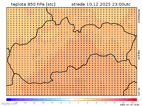Obr. 5: Predpoveď teploty v hladine 850 hPa (v nadmorskej výške asi 1,5 km) podľa modelu ICON.