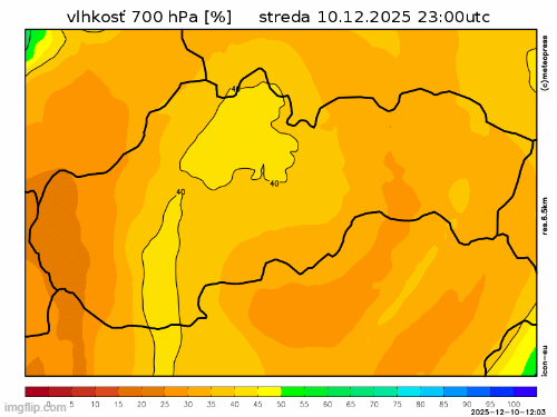 Obr. 4: Predpoveď vlhkosti vzduchu v hladine 700 hPa (asi vo výške 3 km) podľa modelu ICON.