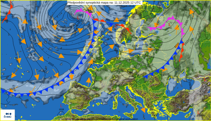 Obr. 1: Predpoveď synoptickej situácie na štvrtok, 11. decembra. Zdroj: ČHMÚ