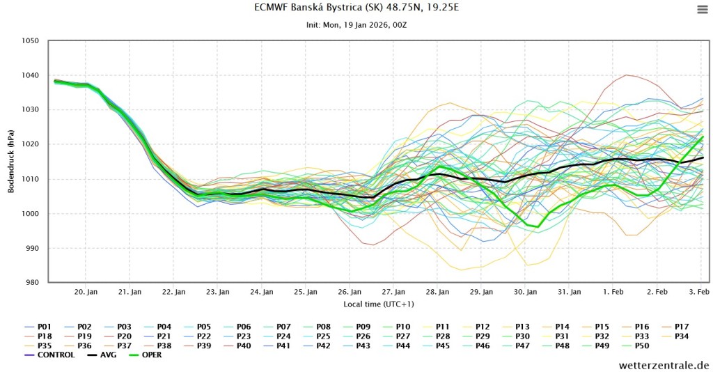 Obr. 4: Ansálmblová predpoveď prízemného tlaku vzduchu nad Banskou Bystricou na najbližších 14 dní. V rámci najblžších 2 dní by mal byť výrazný pokles tlaku, potom bez výrazných zmien. Väčší rozptyl hodnôt po 26. 1. nám naznačuje vyššiu neistotu v predpovedi.