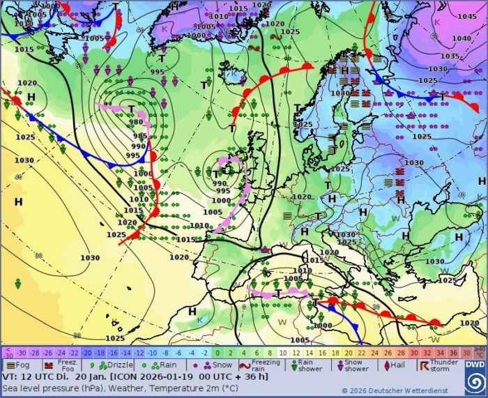 Obr. 1: Synoptická situácia – utorok (20. 1.)