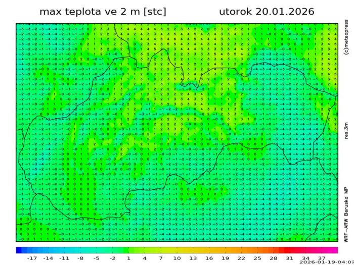 Obr. 3: Predpokladaná maximálna teplota vzduchu v utorok (20. 1.) podľa modelu WRF