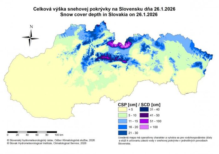 Obr. 3 Celková výška snehovej pokrývky ku 26.1.2026. Zdroj: SHMÚ.