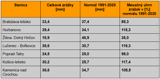 Najnižší mesačný úhrn zrážok bol nameraný v Gánovciach 15,9 mm a najvyšší mesačný úhrn zrážok bol nameraný na stanici Nižný Komárnik 70,7 mm.