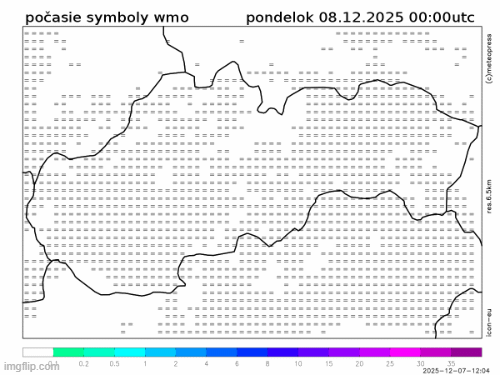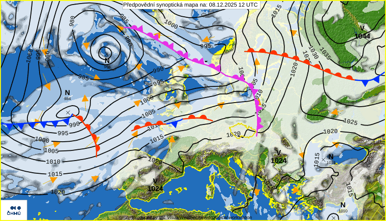 Obr. 1 Synoptická analýza na pondelok 8.12.2025. Zdroj: ČHMÚ.