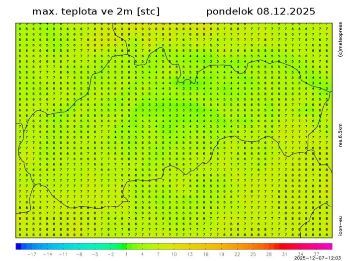 Obr. 4 Maximálna denná teplota podľa modelu ICON-EU.