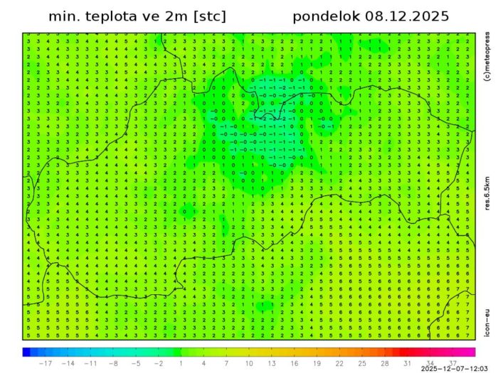 Obr. 3 Minimálna nočná teplota podľa modelu ICON-EU.