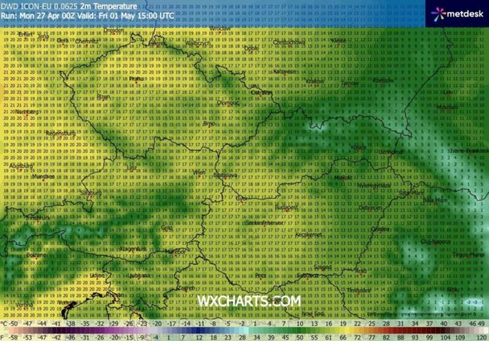 Obr. 5 Teplota v 2m nad zemou podľa modelu ICON-EU. Zdroj: wxcharts.com