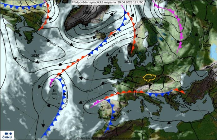 Obr. 3 Synoptická analýza na stredu 29.4.2026. Zdroj : ČHMÚ.