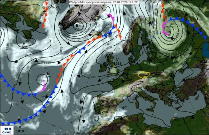 Obr. 1 Synoptická analýza na utorok 28.4.2026. Zdroj : ČHMÚ.