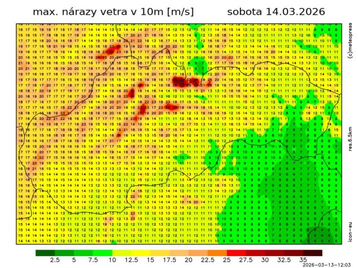 Obr. 3 Maximálne nárazy vetra podľa modelu ICON-EU.