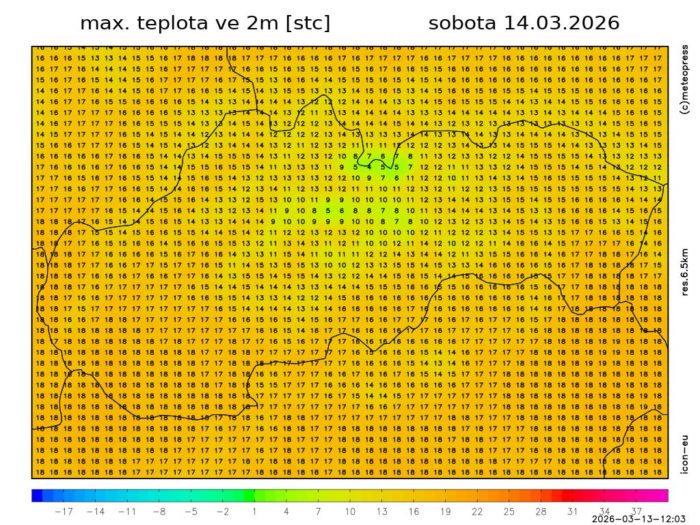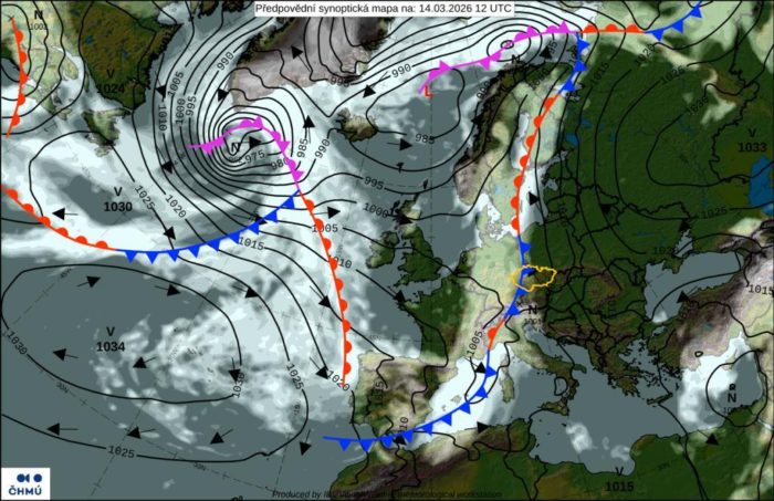 Obr. 1 Synoptická analýza na sobotu 14.3.2026. Zdroj: ČHMÚ.