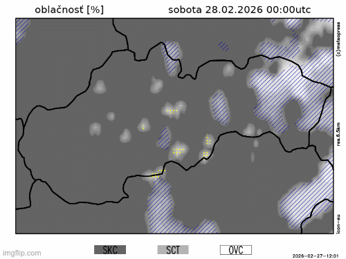 Obr. 2: Predpokladaný vývoj oblačnosti na Slovensku v sobotu (28. 2.) podľa modelu ICON-EU