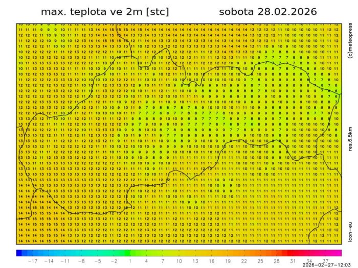 Obr. 4: Predpokladaná maximálna teplota vzduchu v sobotu (28. 2.) podľa modelu ICON-EU