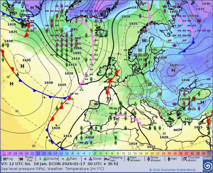 Obr. 1: Synoptická situácia – nedeľa (18. 1.)