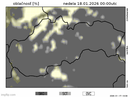 Obr. 2: Predpokladaný vývoj oblačnosti na Slovensku v nedeľu (18. 1.) podľa modelu ICON-EU