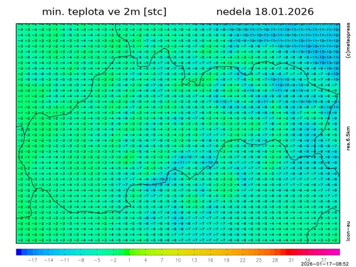 Obr. 3: Predpokladaná minimálna teplota vzduchu v nedeľu (18. 1.) podľa modelu ICON-EU