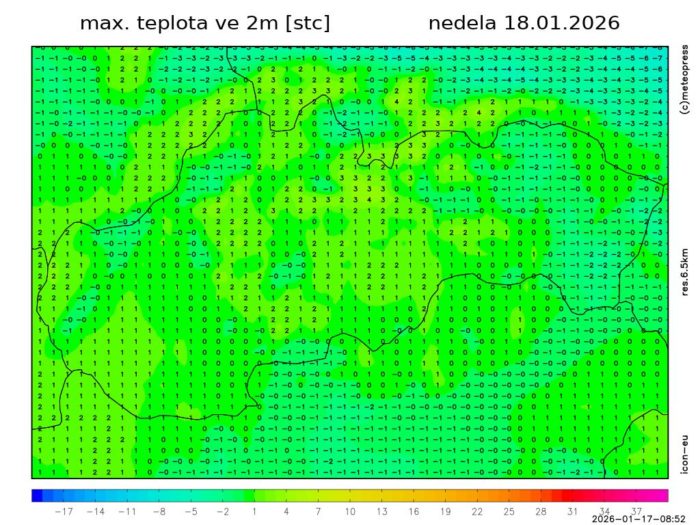 Obr. 4: Predpokladaná maximálna teplota vzduchu v nedeľu (18. 1.) podľa modelu ICON-EU