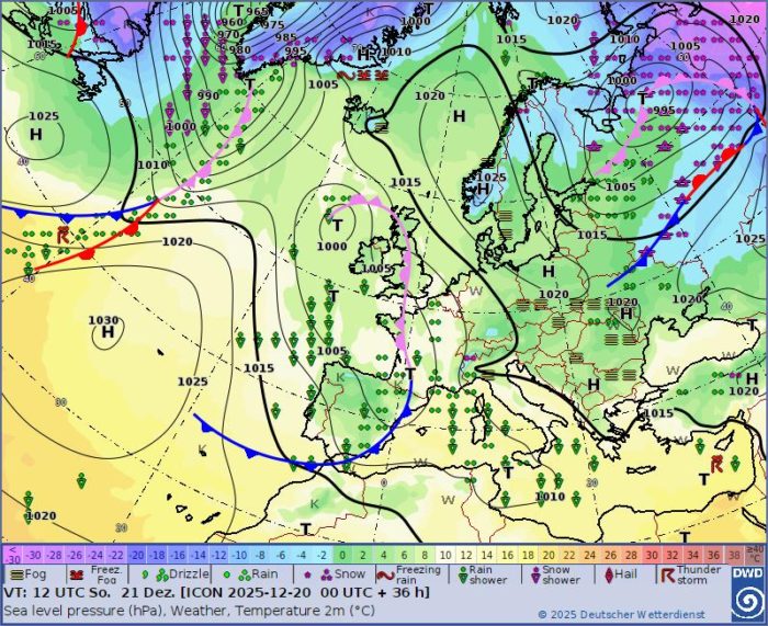 Obr.1: Synoptická situácia – nedeľa (21. 12.)
