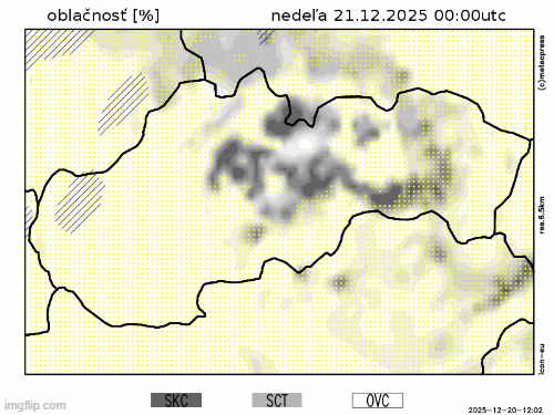 Obr. 2: Predpokladaný vývoj oblačnosti na Slovensku v nedeľu (21. 12.) podľa modelu ICON-EU