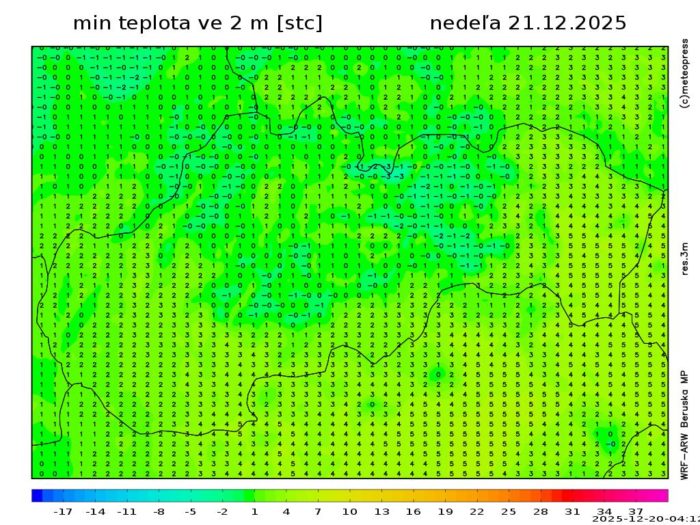 Obr. 3: Predpokladaná minimálna teplota vzduchu v nedeľu (21. 12.) podľa modelu ICON-EU